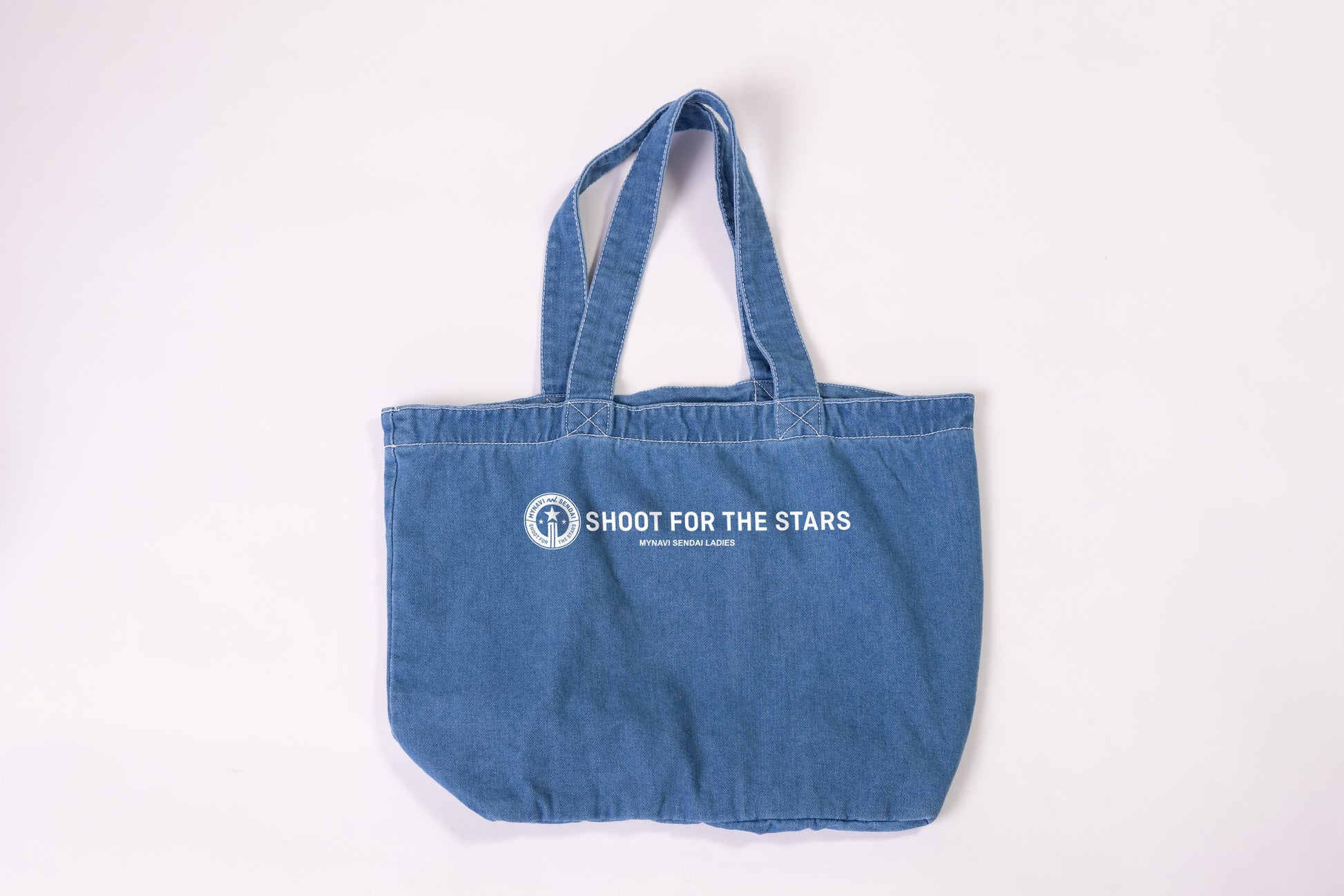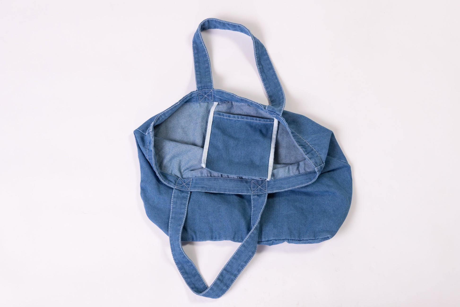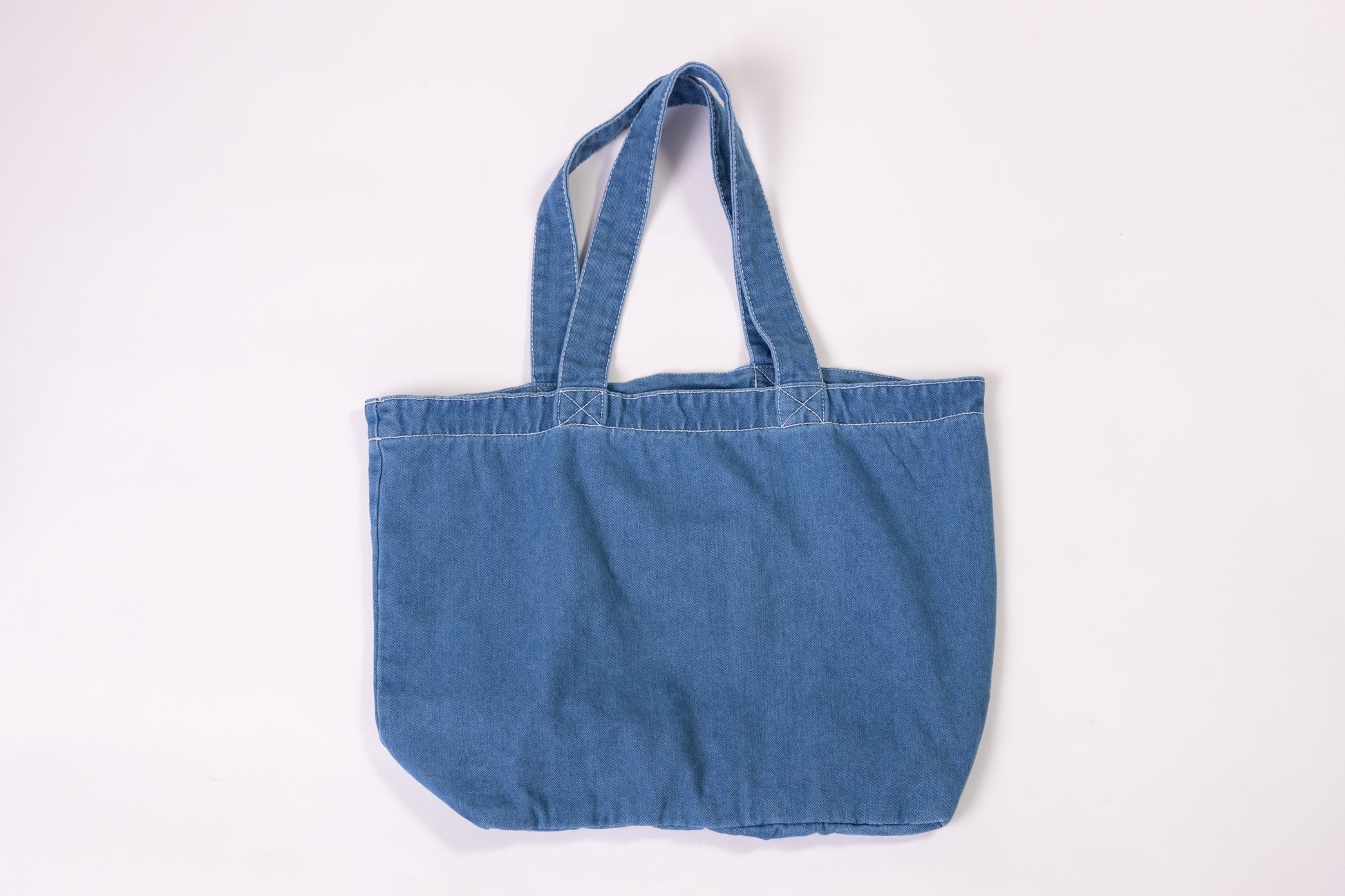 デニム生地のトートバッグにプリントが施された、シンプルなトートバッグです。